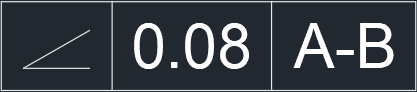符号为一角度(∠),符号后面的数字标注为倾斜度公差、被测要素和基准要素。
