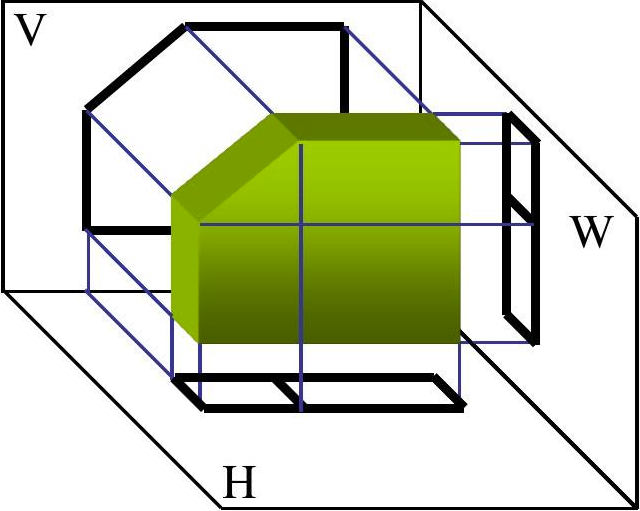 2、V 面:正立投影面,物体在 V 面(正立投影面)上的投影称为正面投影;