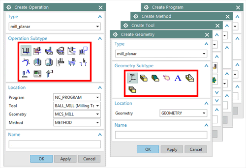 通过创建工序对话框中的工序子类型组选择不同的工序模板。