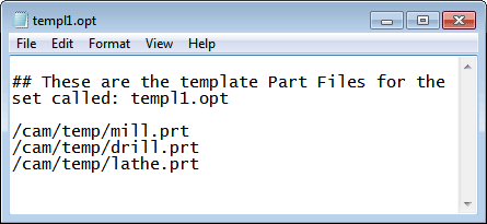 模板部件文件(.prt)创建并保存后,将其按逻辑归组到模板集(.opt)中。通过创建一个 ASCII 文本文件来定义模板集,如下所示。该文本文件必须包含设置中各个模板部件文件的路径名和文件名,并保存为 .opt 扩展名。可以在 ## 字符后面插入注释。