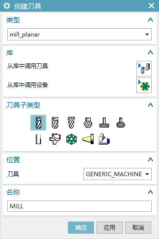 选定合适的刀具,工序将使用该刀具对几何体进行加工。如果之前没有创建刀具,则在刀具下拉列表中没有可选刀具。需要在某一加工类型的对话框中单独创建。