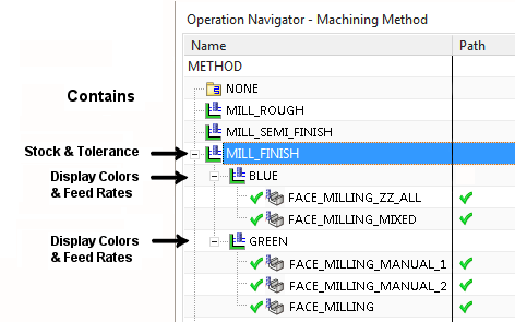 ④列在 BLUE 父组下的工序从 MILL_FINISH 继承余量和公差信息,从 BLUE 继承显示颜色和进给率信息;