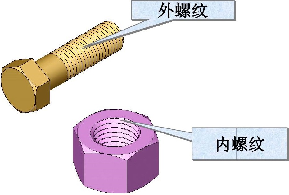 在外圆表面形成的螺纹称外螺纹,在内孔表面形成的螺纹称内螺纹。
