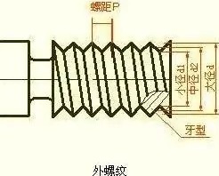 外径(大径):与外螺纹牙顶或内螺纹牙底相重合的假想圆柱体直径。螺纹的公称直径即大径。