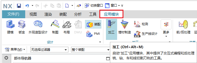 NX 的【应用模块】选项卡>【加工】命令允许以交互方式编写刀轨程序: