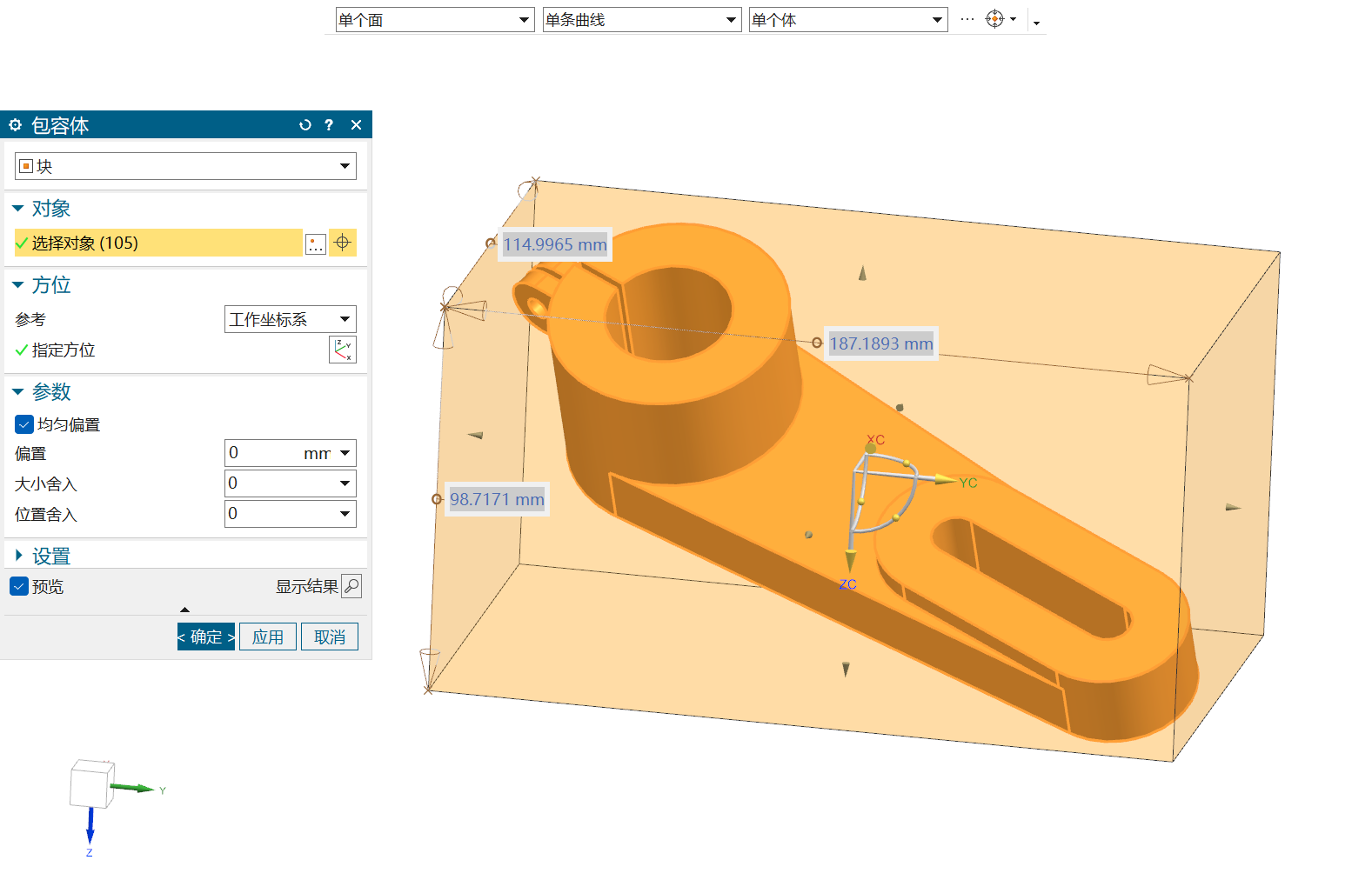 进入【NX-建模】应用模块,【菜单(M)】>【插入(S)】>【偏置/缩放(O)】>【包容体(B)】。